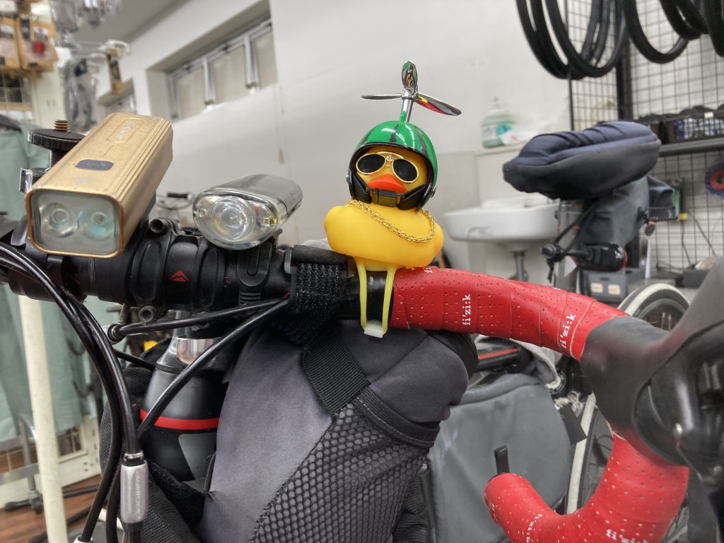 加えて、ハンドルには旅の相棒のアヒル君(スイカver)を搭載しています。